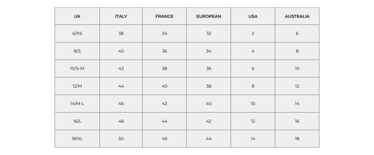 - All sizing is shown in UK sizing from UK6-UK16.