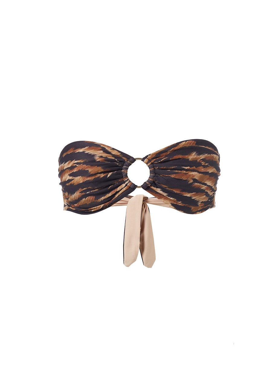 Choose swimwear to match your exotic destination with the Ancona Bikini Top. Its wild ‘Safari’ print will ensure you turn heads on your walk to the pool. Featuring removable straps and pads, the bandeau top has a golden ring at the centre, finished with a tie fastening at the back.